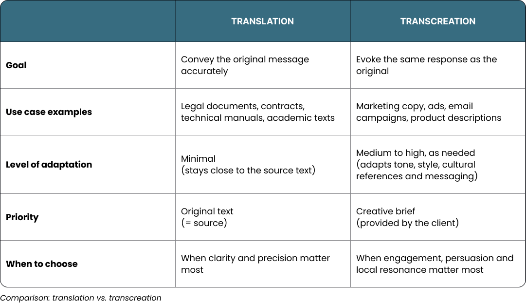 So, how do you decide between translation and transcreation? It all comes down to intent, audience and purpose. Some parts of your marketing content may call for precision, while others rely on emotional impact and cultural nuance.