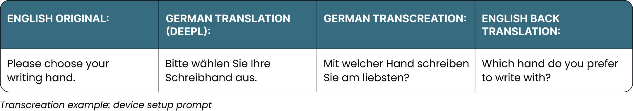 Framing this prompt as a question puts German users more at ease and invites a moment of reflection. The straightforward translation works too, but the transcreation puts empathy first – and that’s often what makes the difference.
