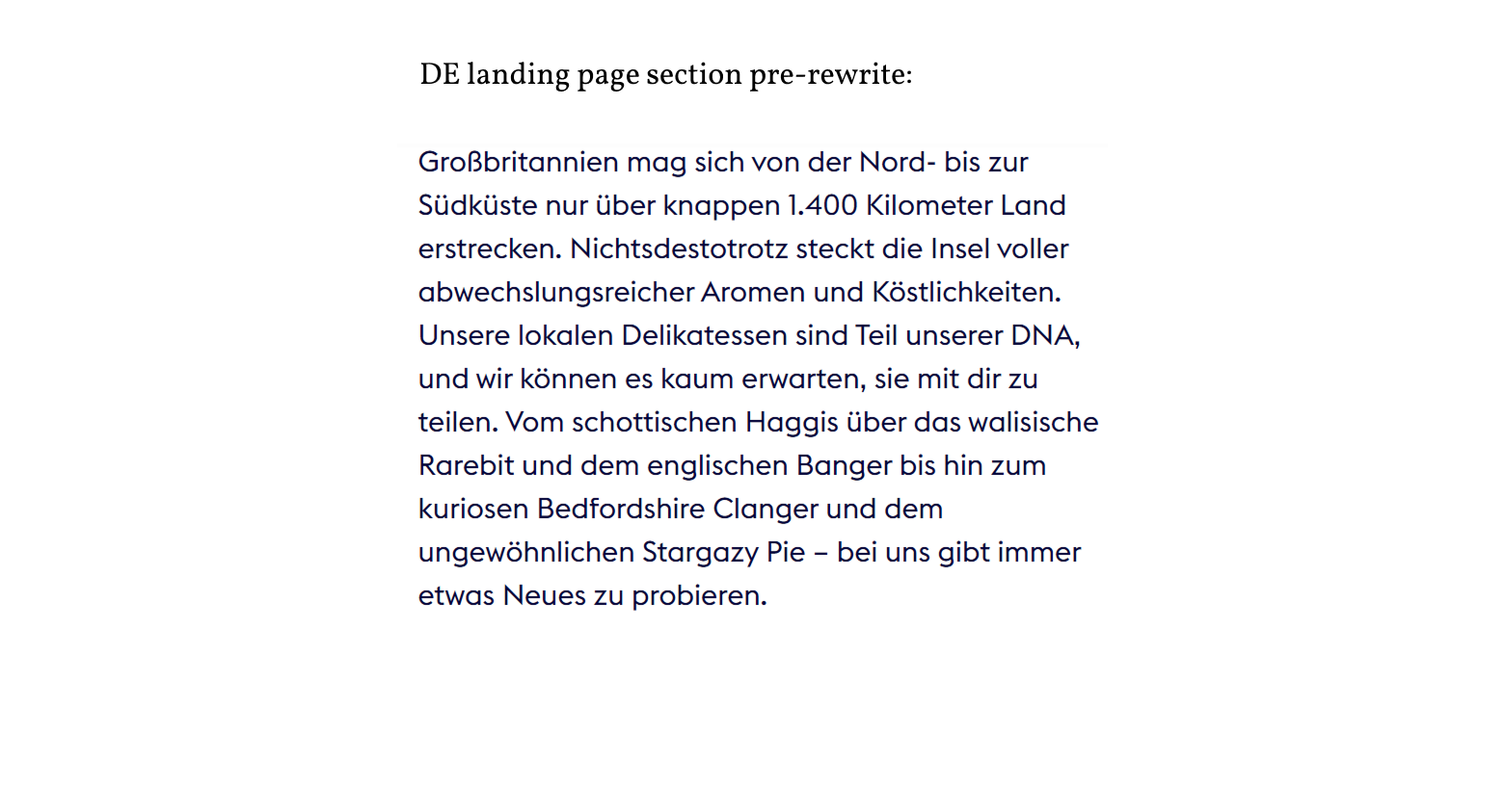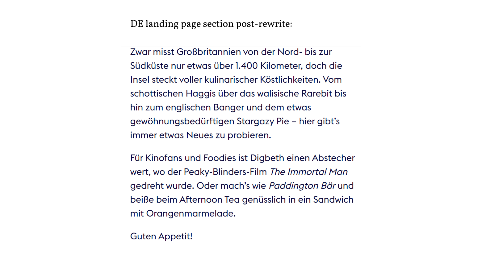 Following a thorough briefing session and a successful test piece, the content team and I established an ongoing collaboration. We typically cover three to four articles of around 1,000 words per month. Titles such as Romantic breaks in Britain and London film and TV itinerary highlight the diversity of travel themes and destinations the series covers. Crafting German versions of these articles allows me to step into the mindset of someone planning their next trip to Great Britain. In early 2026, we also optimised landing page intros for a Google and Meta ad campaign.